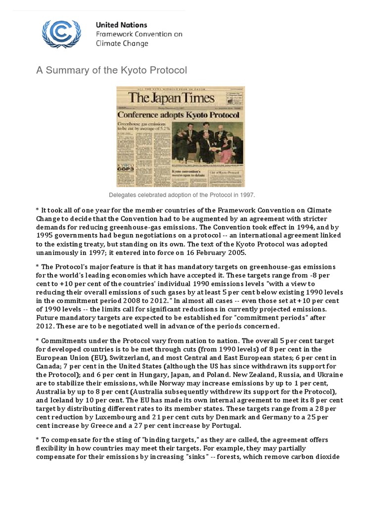 Both countries, which are already poised to lead the world in renewable energy, have made significant progress to meet their Paris goals. The Paris Agreement is the culmination kyoto protocol essay decades of international efforts to combat climate change. Here is a brief history. InPresident George H. Bush joined other heads of state at the Rio Earth Summit in Brazil to adopt a series of environmental agreements, including the UNFCCC framework that remains in effect today.